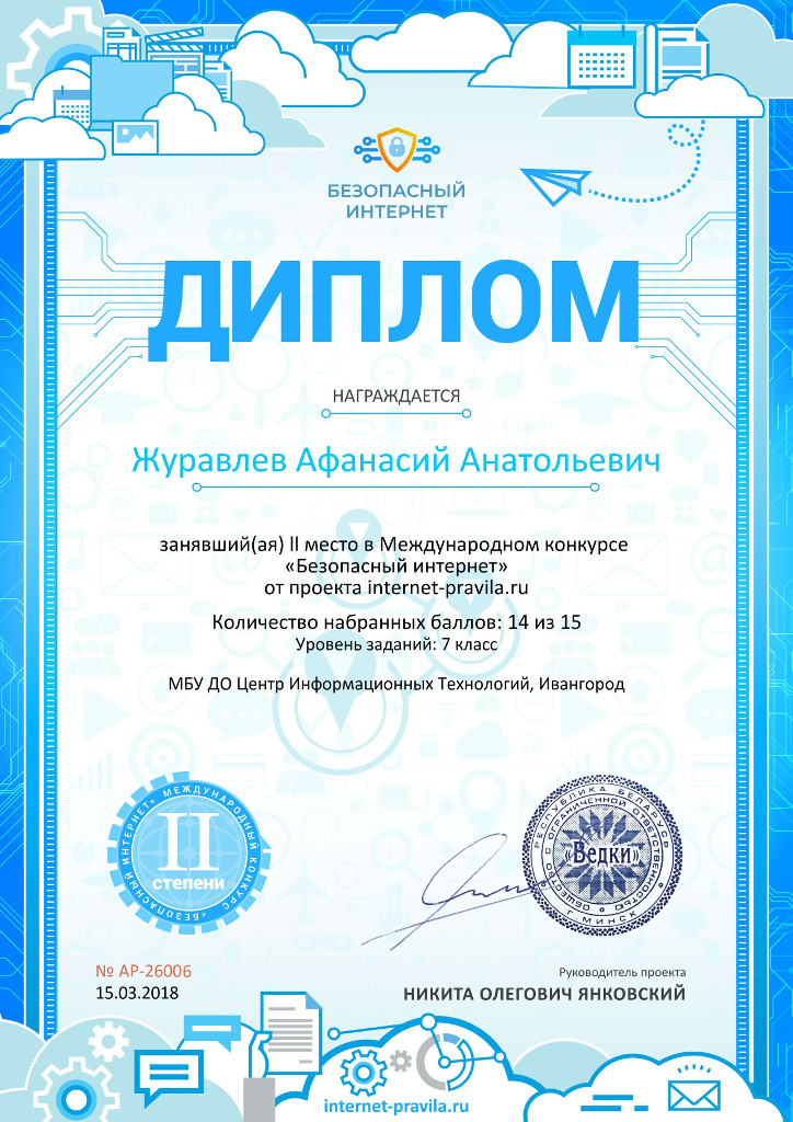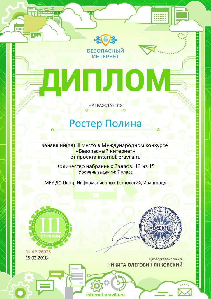 20 учеников педагога дополнительного образования Казаковой Л.А. принимали участие в конкурсе «Безопасный интернет» на портале https://internet-pravila.ru/. Пятеро из них стали призерами конкурса.