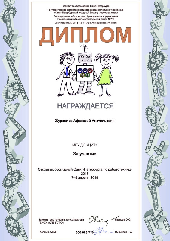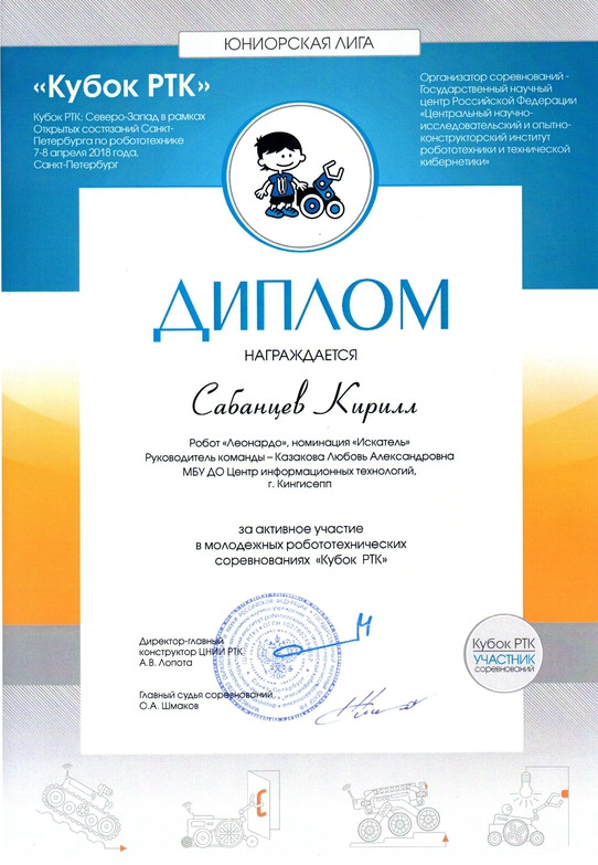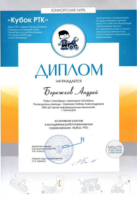 Бережков Андрей, Сабанцев Кирилл и Журавлев Афанасий принимали участие в «Кубке РТК» уже в четвертый раз, но на большом полигоне соревновались только второй. В финал прошли 15 команд. По результатам соревнований, наша команда заняла 7 место и набрала 260 баллов. По сравнению с предыдущими соревнованиями, наша команда улучшила свой результат. В октябре 2017 на фестивале Робофинист ребята заняли 10 место, набрав 150 баллов.