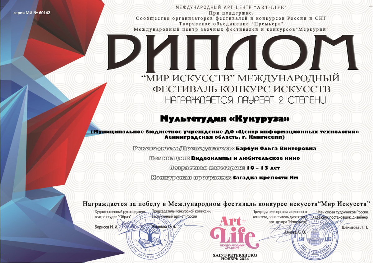 По итогам Международного фестиваля-конкурса искусств «Мир искусств» наша мультстудия «Кукуруза» (руководитель Барбун Ольга Викторовна) стала Лауреатом II степени за работу «Загадка крепости Ям».